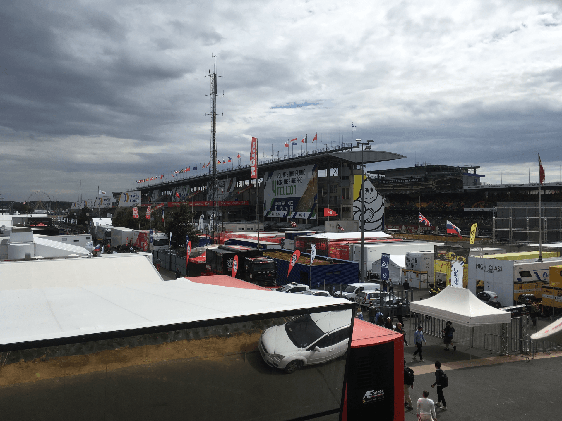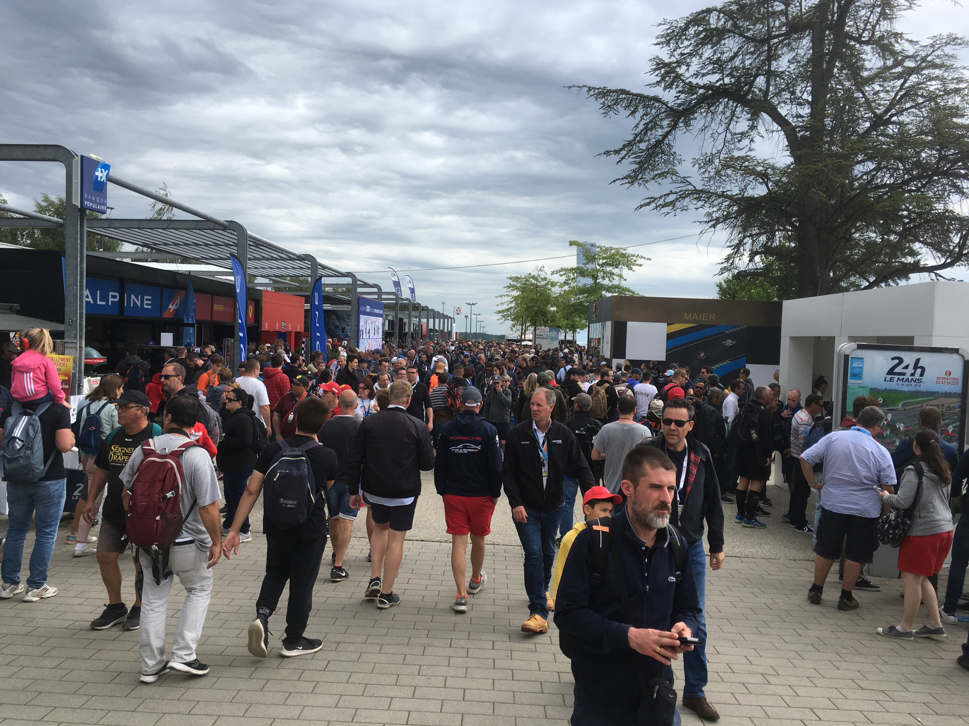 The Village has several bars, food outlets and a couple of restaurants (one overlooking the pits, the other overlooks the circuit, just a bit past Track Pit Exit on the main straight). There is fast food, at least a couple of basic sit down meal places and at least one crepe stall. There is also a Champagne Bar which is usually round the side of the village facing the ACO admin offices at the back of the Village, not the one on the start/finish straight).